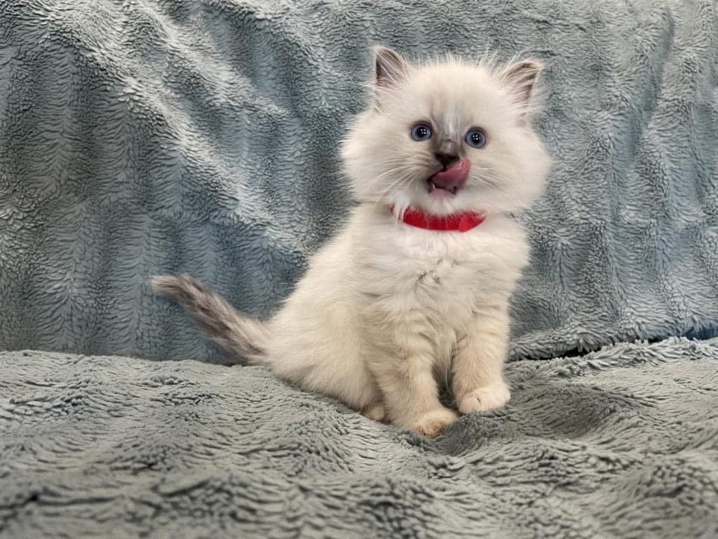 Chloé est une adorable Ragdoll Blue Colorpoint au pelage encore très clair qui foncera en grandissant. Pétillante et espiègle, elle croque la vie à pleines dents ! Ses yeux bleus et son petit air malicieux (photo prise en plein bain de langue !) résument parfaitement sa personnalité joyeuse. Un vrai concentré de bonheur.