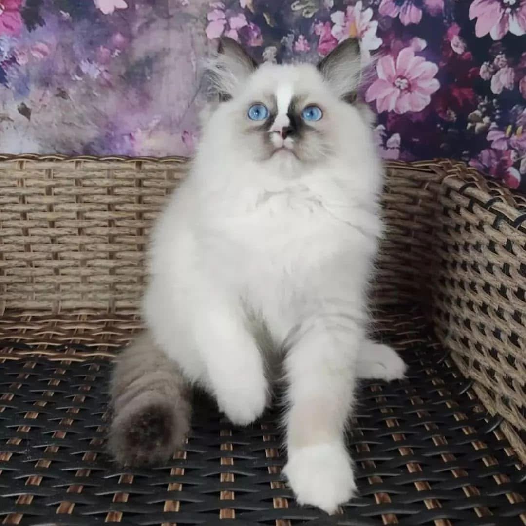 Jaspher est un Ragdoll au regard bleu intense et au pelage Seal Mitted avec de jolis gants blancs aux pattes. Assis dans son panier en osier, il dégage une sérénité remarquable. Calme et posé, c’est un chaton qui apprécie le confort et la tranquillité. Idéal pour un foyer calme ou des personnes âgées.